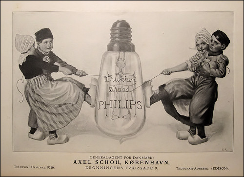| Reklame for Philips glødelampe med trukken tråd. Reklamen er at finde bagerst i lærebogen Stærkstrømselektroteknik fra 1916. "General-Agent for Danmark: Axel Schou, København ... Telegram-Adresse: »EDISON«". |