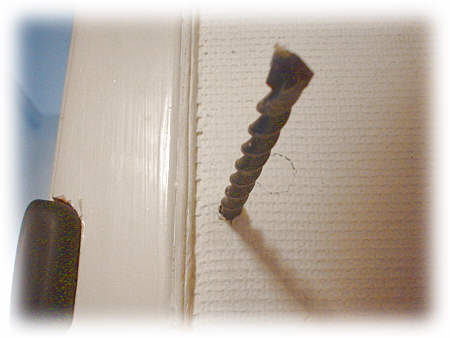 | Et sjældent syn i en væg af hård beton: et gennemføringshul uden at en større skal er blevet slået af væggen. Et kraftigt hessian-tapet holdt på hat og briller. Ved mursten kan man prøve at slå hammerslagsfunktionen fra når man nærmer sig gennembrydningen, men i hård beton kommer man ikke rigtig nogen veje uden hammerslag. Dørtelefonen placeres så ledningsindføringen bliver skjult. |