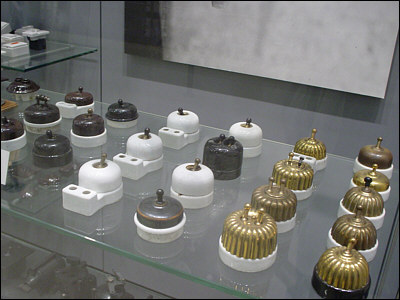 | Gamle afbrydere og stikkontakter i messing og porcelæn fra 1910-1920'erne. |