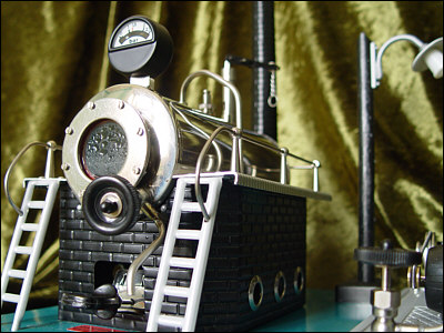 | En blankpoleret kedel, der rummer 500 cm3. Nederst brændeskuffen, hvor der fyres op under kedlen. Forrest en hane til aftapning af vand fra kedlen. |