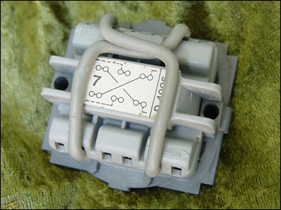 | Bagsiden af en krydsningsafbryder. Denne type afbryder anvendes i en traditionel korrespondancetænding når der skal være mere end 2 tænd/sluk-kontakter. Det optegnede kryds i midten angiver to ledningsstumper, der skal monteres for at komponenten kan virke som krydsningsafbryder. Linjerne ude i kanten ved de midterste terminaler og ved terminalerne til højre viser, hvortil installationsledningerne skal tilsluttes. |