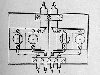 | I Peschelrørsystemet blev stålrørene med spændingsførende ledere anvendt som nulleder når denne var jordforbundet i forsyningssystemet. På billedet ses en fordelingstavle. Rørene er fastgjort under en fælles bøjle foroven og forneden. En elektrisk forbindelse mellem de to bøjler sørger for, at nullen føres fra tilgangs- til afgangsside. Illustration fra Karl Strecker: Hilfsbuch für die Elektrotechnik, 1921. |