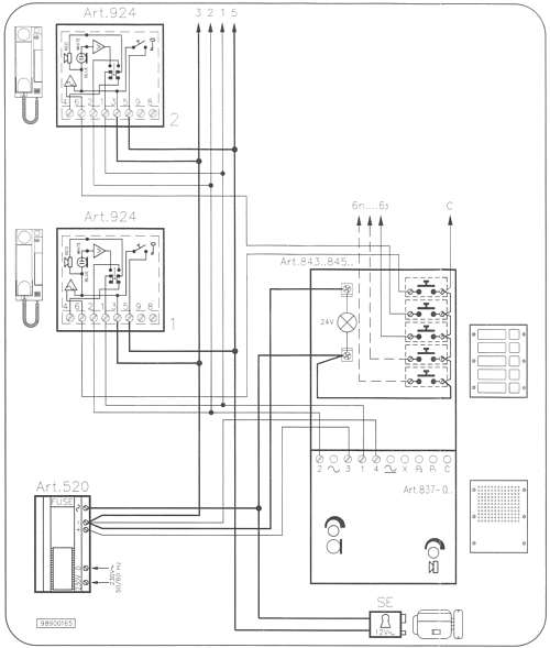 | Eksempel på et diagram til samling af et dørtelefonanlæg. De kraftigere optrukne linjer anviser, hvor ledningens kvadrat bør forøges. Den normale tykkelse på signalkabel er 0,5-0,6 mm. Små ledninger angives ofte ved diameteren, mens større ledninger altid angives ved kvadratet. Ved at parallelkoble to ledere opnås et forøget tværsnit på de kraftigt optrukne linjer. Det bemærkes, at der er 4 ledninger som er fælles for alle telefoner, navngivet 3, 2, 1 og 5. Endvidere går der en ringetrykledning fra gadetableuet til hver enkelt telefon til terminal 6. Derfor benævnes anlægget 4+1, og det er nemt at regne ud, hvor mange ledninger i kablet på stigningen, der er nødvendigt. |