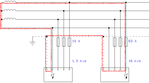 IT-systemjording og nulledereOvenstående lampesystem ville ikke give indikation af en afledningsfejl fra nullen, såfremt denne var fremført. Ifølge SB-A6 § 473.3.2.2 anbefales det kraftigt at undlade fremføring af nullederen ved IT-systemjording. Hvis den alligevel fremføres skal der foretages overstrømsdetektion i nullederen. Det vil i praksis sige brug af 4-polede automatsikringer (efter sigende skelnes der mellem 4-polede automater og automater mærket 3-pol + N, hvor sidstnævnte type ikke detekterer overstrømme i nullen) eller maksimalafbrydere. Smeltesikringsgrupper har af gode grunde aldrig en sikring i nullen.Hvis en IT-systemjordingsinstallation bliver udført med nullen fremført, og med overstrømsbeskyttelsesudstyr i form af smeltesikringer, kunne man forstille sig, at der på en brugsgenstand skete en fejl fra nul til stel (1. fejl), fx på en strømkreds med en 10 A gruppe med 1,5 mm2 ledning. Skulle der opstå en fejl nummer 2, en fase blev fx lagt til stel på en anden brugsgenstand, for eksemplets skyld en 63 A gruppe, ville førstnævnte 1,5 mm2 kabel være kortslutningsbeskyttet af en 63 A sikring med risiko for et for stort energigennemslip I2t i fejltilfælde (opvarmning af kablet). Fejlsløjfen ville gå fra fase til stel på den ene brugsgenstand, videre gennem beskyttelsesledere til den anden brugsgenstands stel og endelig nå nullen. Sløjfen, med fasespændingen som drivkraft, ville først blive brudt når 63 A sikringen smeltede pga den manglende overstrømsdetektion i nullen i 10 A gruppen. Hvis nul- og PE-leder er kortslutningsbeskyttet med de forskellige kombinationer af fejl der kan opstå, kunne der i princippet godt bruges smeltesikringer, jf nævnte § 473.3.2.2.
