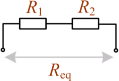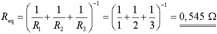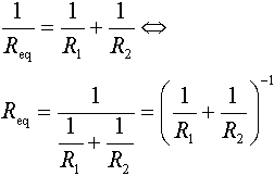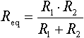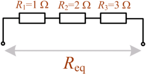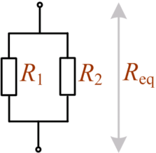 En kombination af resistanser R i serie- eller parallelforbindelse kan erstattes af en enkelt ækvivalent resistans Req. Det betyder, at den givne modstand [Ω] målt på tilslutningsterminalerne på de to ækvivalente kredsløb er præcis den samme. Beregningsprincipperne gælder også for impedanser Z. Ækvivalent til serieforbindelseDen ækvivalente resistans for et antal modstande i serie er lig med summen af de enkelte modstandsværdier.EksempelEt eksempel på beregning af den ækvivalente resistans for 3 modstande i serie.Det er karakteristisk, at den ækvivalente resistans er større end den største af de resistanser, der indgår i serieforbindelsen. Ækvivalent til parallelforbindelseDen reciprokke værdi af den ækvivalente resistans er lig med summen af de reciprokke resistanser, der indgår i parallelforbindelsen.Ovenstående formel er en generel formel, der kan anvendes uanset antallet af parallelle resistanser. To resistanser i parallelI det tilfælde, at der kun indgår to resistanser i parallelforbindelsen, kan følgende formel anvendes.En huskeregel for, hvorvidt det er produktet foroven og summen forneden eller omvendt, er at tænke på, at enheden for den korrekte formel gerne skal komme ud i ohm. For ovenstående formel bliver den resulterende enhed [Ω]2/[Ω] lig med [Ω]. Summeres der i stedet fejlagtigt i tælleren bliver enheden [Ω]/[Ω]2 lig med 1/[Ω]. Dette reciprokke resultat svarer til ledningsevnen G, der måles i siemens [S]. Ledningsevne ses også benævnt mho, ohm stavet bagfra. EksempelEt eksempel på beregning af den ækvivalente resistans for 3 modstande i parallel.Det er karakteristisk, at den ækvivalente resistans er mindre end den mindste af de resistanser, der indgår i parallelforbindelsen. Interne links til emner i dette opslag: Eksterne links til emner i dette opslag: