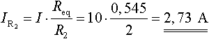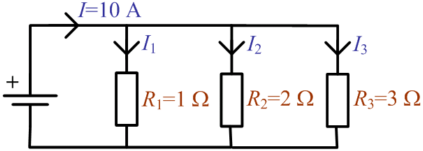 Et eksempel på beregning af strømstyrken gennem R2 i en parallelkobling af tre resistanser, der tilsammen deler en strømstyrke I på 10 ampere.