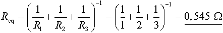 Ved anvendelse af den alternative strømdelerformel findes først den ækvivalente resistans Req for de 3 resistanser i parallel.