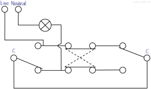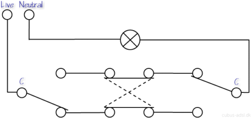 When more than two locations where to turn the light on and off are necessary the extra switches must be of another type called intermediate switches (UK) or four-way switches (US). It will be seen in the following diagrams that these switches are placed in between the before-mentioned two-way switches in all wiring circuits (A-, B- and C-type).
